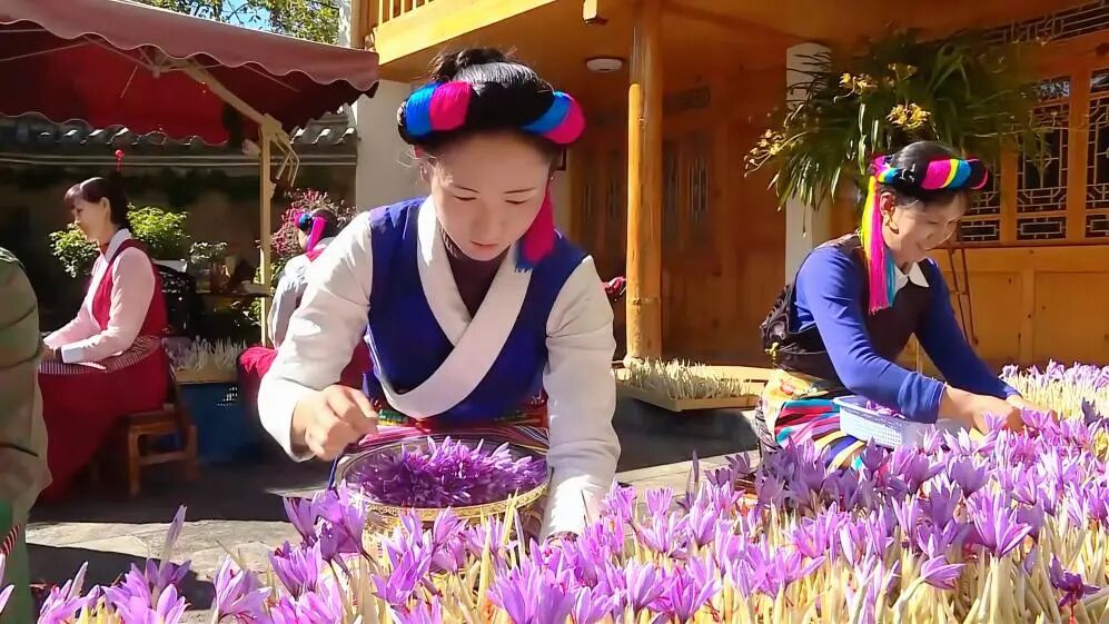 ▲云南省迪庆藏族自治州维西傈僳族自治县塔城镇其宗村,村民正在整理藏红花。(图片来源:新华社)