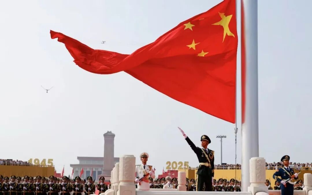 ▲9月3日,纪念中国人民抗日战争暨世界反法西斯战争胜利80周年大会上的升国旗仪式。(新华社记者 费茂华/摄)
