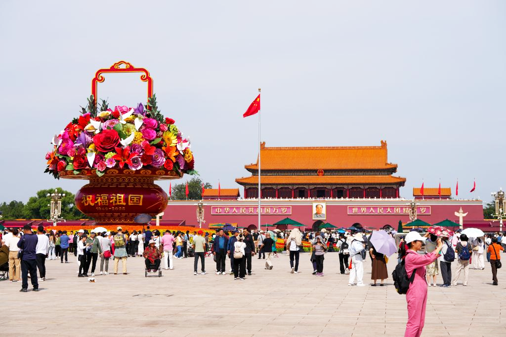 ▲游客在天安门广场观赏“祝福祖国”大花篮。(新华社记者 鞠焕宗/摄)